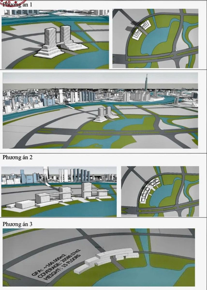 Cụ thể, ba phương án quy hoạch được đưa ra gồm: (1) Giữ nguyên toàn bộ công viên trung tâm, chỉ sử dụng khu đất 16ha để xây dựng. (2) Mở rộng diện tích xây dựng lên hơn 33 ha, bao gồm một phần đất công viên, với mật độ xây dựng 40–60% và chiều cao công trình tối đa 35 tầng. (3) Kết hợp cải tạo công trình hiện hữu với việc xây mới trên quỹ đất bổ sung, nhằm tiết kiệm chi phí và rút ngắn thời gian triển khai.
